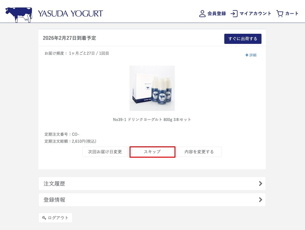 2. スキップ(お休み)したい定期注文の「スキップ」を押します