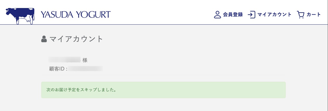 「次のお届け予定をスキップしました。」と表示されていればスキップ(お休み)のお申し込みは完了です。