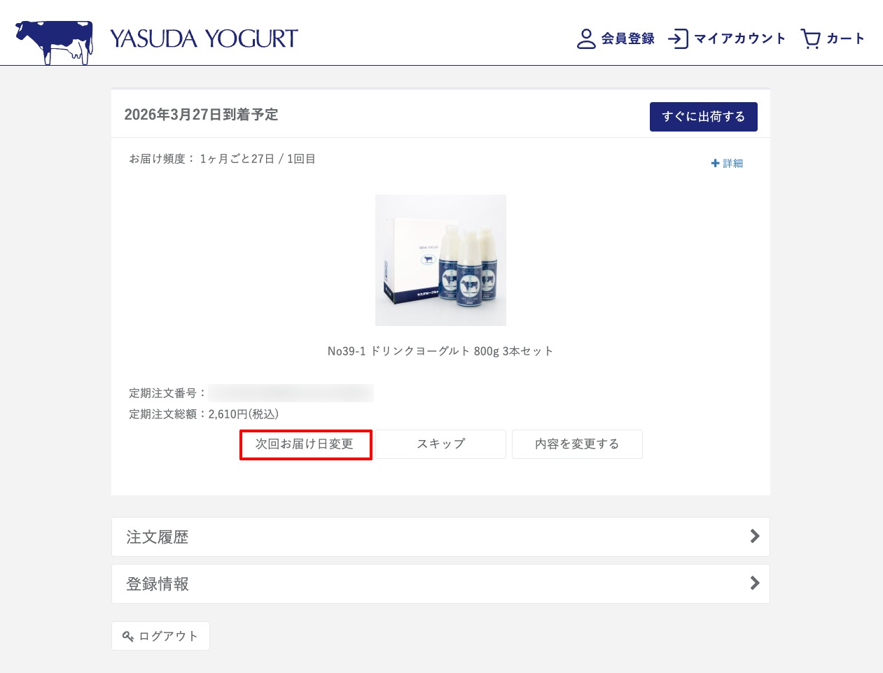 2. 変更をしたい定期注文の「次回お届け日変更」を押します