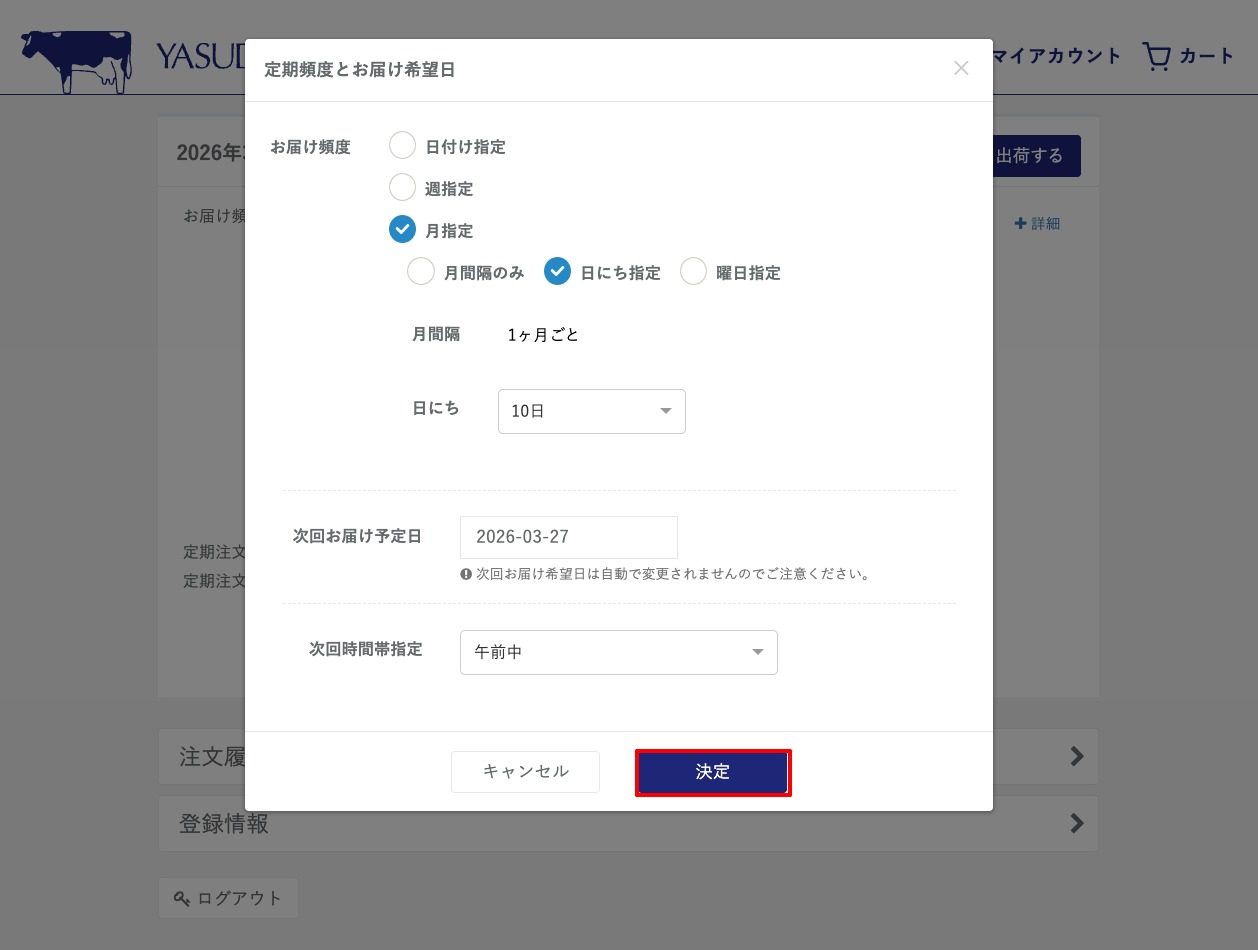 マイアカウントより、「毎月○日にお届け」「毎週○曜日にお届け」など、お届けサイクルの変更が可能です。